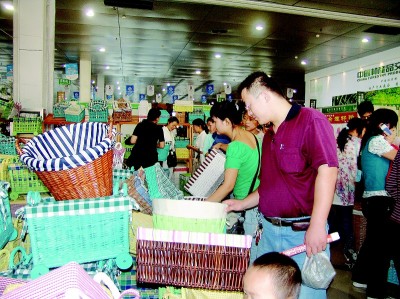 曹县展区内美家家居用品有限公司展览的条柳编制品深受客商欢迎,引来众人踊跃选购。