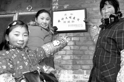 单县朱集镇门庙村“好媳妇”诸葛景霞(中)在女儿的指挥下,同婆婆一起将新获得的“好媳妇”奖匾挂到堂屋墙上。日前,单县妇联与乡镇(办事处)、村联合评选表彰了600多名“好媳妇”、“好婆婆”。这些“好媳妇”、“好婆婆”集中体现了新农村建设中“巾帼不让须眉”的时代精神风貌,在社会上引起强烈反响。