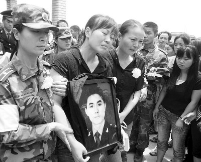△6月24日,烈士武文斌的妻子捧着亲人的遗像,群众和部队官兵伫立两旁为烈士送行。当日,在抗震救灾中牺牲的济南军区“铁军”部队炮兵指挥连实习士官学员武文斌的遗体在四川都江堰市殡仪馆火化。26岁的武文斌是河南邓州人,因连日救灾过度劳累引发肺血管畸形破裂出血,于6月18日献出了年轻的生命。新华社发