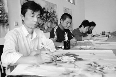巨野县麒麟镇洪庙村的农民在作画。巨野县两眼向外,加大对文化品牌的包装与宣传。今年先后组织参加国家级展览26次,参展作品120余件;参加省级展览40余次,参展作品2000余件。参加和举办大型展销会40余次,展销作品万余幅。