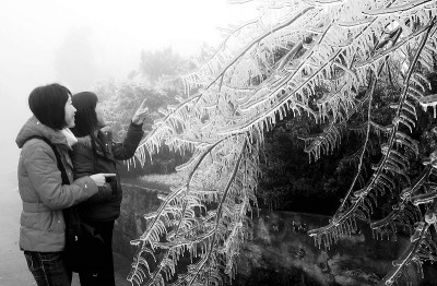 3月1日,游客在江西九江庐山小天池景区欣赏雨凇。