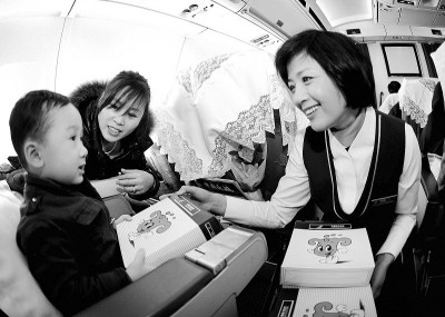 △1月14日,乘务员刘淑娟(右)向两岁半的周昕翰小朋友赠送礼品。当日,8名拥有30年飞行服务经验的资深乘务长共聚南航CZ6101航班,担任乘务员工作。30年前,她们作为新中国第一批地方公开招收的“空中小姐”,掀开了中国民航服务史上新的一页。30年来,她们始终没有离开心爱的客舱,美丽而从容地奔忙在各条航线上。她们见证了中国民航事业的发展,用最美丽的微笑给乘客和自己留下了美好的记忆。 新华社记者李钢摄