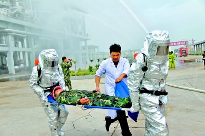 5月26日上午,东明县安全生产应急救援演练在方明化工举行。随着指挥员一声令下,东明县鲁南安全生产应急救援中心两辆消防车疾驰而来,救援队员采取包围合击战术,6支水枪对事故装置进行冷却、扑救,并及时将泄漏堵住。东明县鲁南安全生产应急救援中心成立于2007年,是省政府公布的第二批省级专业应急救援中心,现有100名队员及泡沫消防车、无火花堵漏工具、正压式空气呼吸器等先进救援设备。图为演练现场。