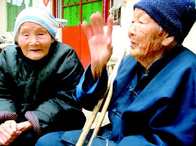 两位老寿星被子孙扶着坐在小板凳上,贴身贴耳地拉起了家长里短。“年轻时,咱姊妹都没少吃苦。”张汪氏说。“可不是么!”陈广莲回答:“老世道兵荒马乱的,没吃没穿,那是过得啥日子啊!”“现在多好,不缺吃不缺穿,咱俩活这么大,算是赶上了眼前的好日子了!”张汪氏话题一转,问:“妹妹,你有几世人啦?”“就在俺家吃饭!”陈广莲答。张汪氏对周围的人说:“聋了,聋了,耳朵不中了!”……
