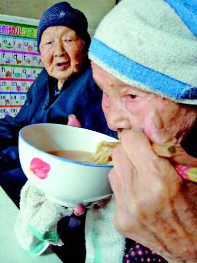 不大会儿,西红柿面条端到了两位老寿星跟前。“吃吧,大姐。”陈广莲边招呼边吃。“忒热、忒热。”张汪氏阻止道。见对方不理睬,张汪氏对陈广莲的孙媳说:“吃热不好,不热不凉吃对身子有好处。”很快,一碗面条就剩汤了,张汪氏瞅着陈广莲,既发急又无奈,不停地自言自语:“这咋中,不知道热凉,我就不能吃热的……”