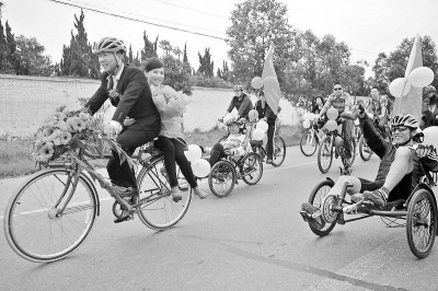 10月16日,新郎陈杰(左一)骑自行车迎娶新娘吴俊琳。