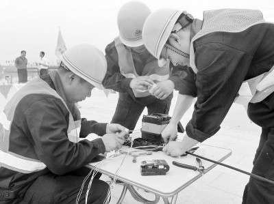 图为菏泽移动公司传输维护人员一丝不苟地抢修设备。
