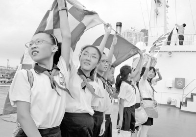当日,山东海警二支队举行迎接航海日船艇开放活动。活动邀请中小学生登上舰艇参观,并开设青少年甲板航海科普课堂,向同学们讲解航海设备、仪器的功能和使用方法。今年7月11日是我国第八个航海日,主题为“感知郑和·拥抱海洋”。 新华社记者李紫恒摄