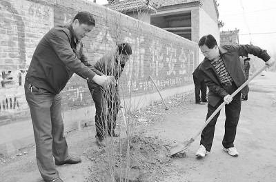 3月12日,市城乡建设局驻鄄城县李进士堂镇边庄行政村和大罗庄村的两名“第一书记”,带领村民种植700棵木槿树,以进一步提高所驻村的绿化率,美化村民的居住环境。 记者 范卉蕾 羊莹春 摄