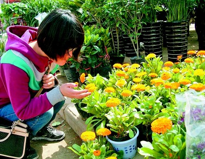 ▼春回大地,柳枝迎风舞、娇莺自在啼,各色花卉竞相开放、争奇斗艳。盛放的鲜花引得行人停下脚步,沉醉在浅香花影中。图为游人轻嗅花香。