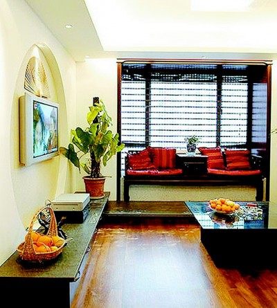 位于客厅的飘窗,窗台十分低矮,开辟巧思设置高度正好的沙发座,具有中式韵味以及品质感的红木家具是最不错的选择,整个沙发座正好架于窗台之上,而沙发座中间添置的迷你茶几,将其划分成宽敞的两人坐,铺上喜庆的中国风坐垫与靠包,就在这细品一壶好茶吧。