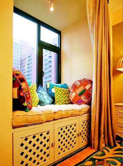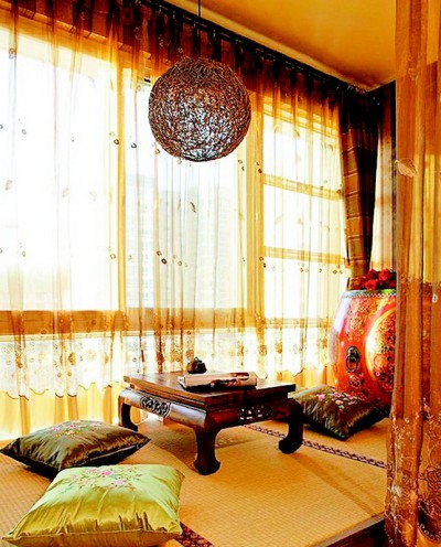 飘窗边的古典中式感,用华丽精美的中国元素打造,绣有金线的薄纱帘、金色刺绣靠包、木质方形茶盘以及青花瓷茶具,简简单单刻画出稳重的中式感。 小青◆编辑的话: