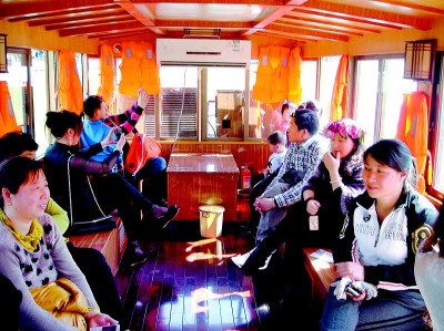 5月6日,来菏赏花的游客在画舫船上欣赏沿河风景。近期,菏泽旅游又添新军——“水上公交”,来菏赏花的游客可以乘船观赏赵王河沿途风景。记者 王丹 摄