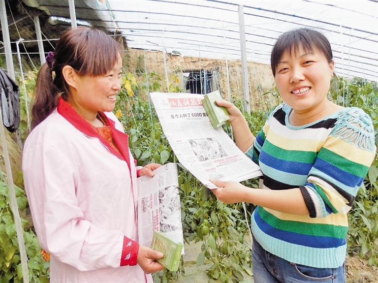 为提高村级计生户致富能力,今年初,成武县文亭街道办事处计生协会在村级确定了19个有致富项目的计生户作为扶持对象,在提供帮扶的同时,还出资为她们订阅了《山东科技报》,受到大家的欢迎。图为日前该办事处计生服务人员把报纸和计生药具送到了小桥村扶持户李玉春的大棚里。