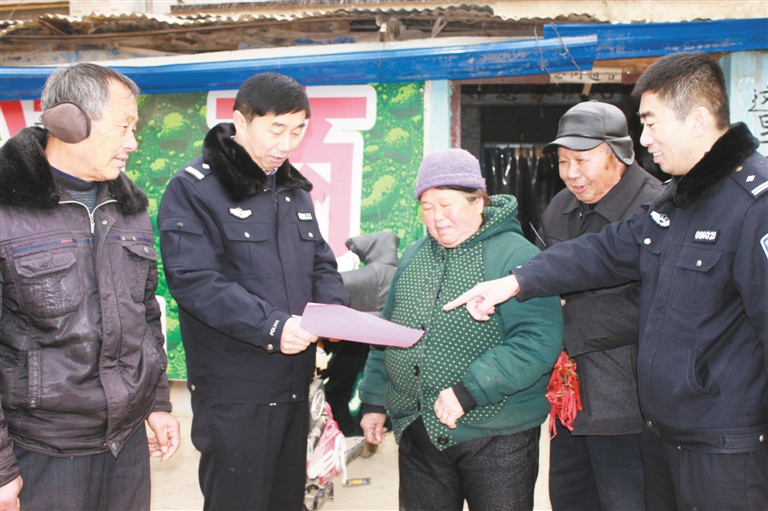 为加强冬季农村群众的安全防范意识,入冬以来,郓城县公安局黄集派出所民警深入辖区农村,向群众发放安全防范材料9800份,讲解防火、防盗、防骗常识,受到群众的好评。图为民警在辖区农村向留守老人讲解冬季安全常识。
