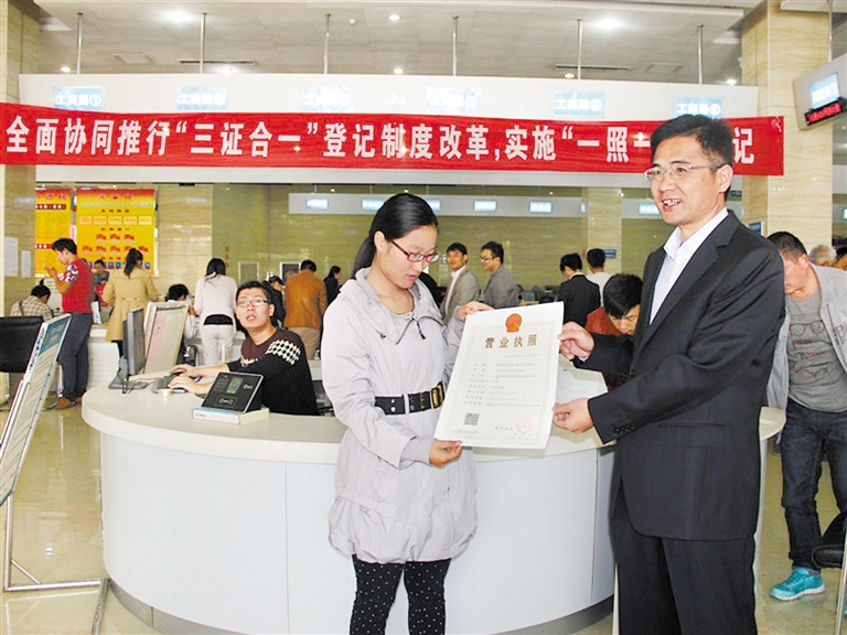 10月8日,在牡丹区政务便民服务中心大厅,放飞餐饮服务有限公司负责人领取了“三证合一”营业执照。据了解,这是该区发放的首张“三证合一”营业执照。