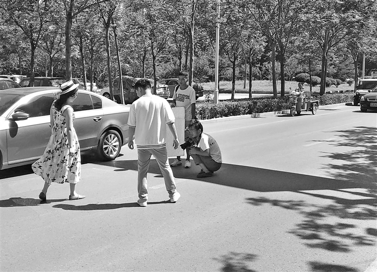 近日,市区康庄路上,两位市民在车辆川流不息的道路上拍照,周围没有任何安全保障措施,不但影响车辆正常通行,还存在安全隐患,过往市民纷纷指责。