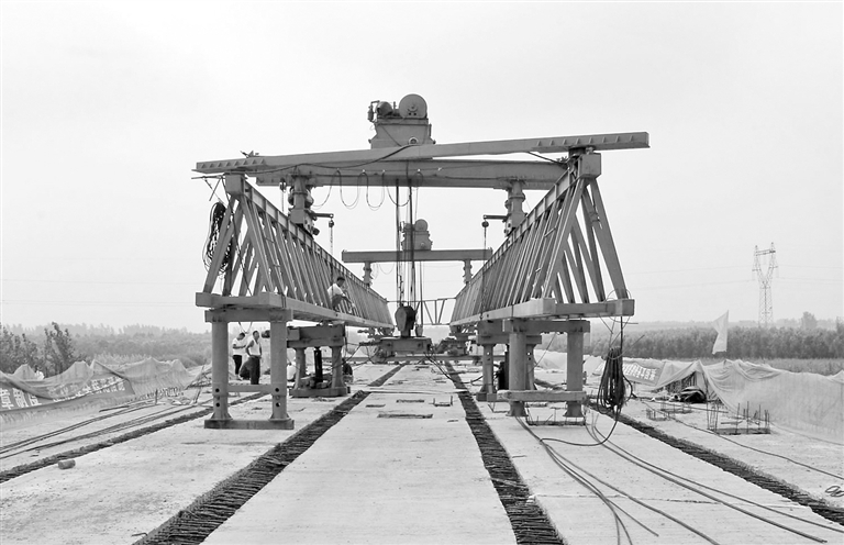 记者在广州路南延跨万福河大桥施工现场看到,横跨万福河的大桥主体已经出现雏形,大桥的右半幅已经铺设完桥面板,左半幅立柱和盖梁已经完工,等待铺设预制箱梁板面。
