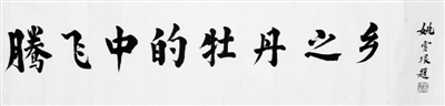 1992年春,为迎接第一届菏泽国际牡丹花会,菏泽市(今牡丹区)摄制电视专题片《腾飞中的牡丹之乡》,派撰稿人时维亮等进京,在时任《人民文学》编辑赵则训(菏泽人)的帮助下拜访了姚雪垠先生,姚雪垠欣然题词“腾飞中的牡丹之乡”。此件作品长160厘米,宽46厘米。姚雪垠(1910—1999),原名姚冠三,字汉英,河南郑州市九龙乡姚营寨人,当代著名作家。曾担任 第五、六、七届全国政协委员及湖北省文联主席、全国文联委员、中国作家协会理事、中国对外友好协会理事等职务。姚雪垠在“文革”中创作的长篇历史小说《李自成》1982 年荣获首届“茅盾文学奖”。