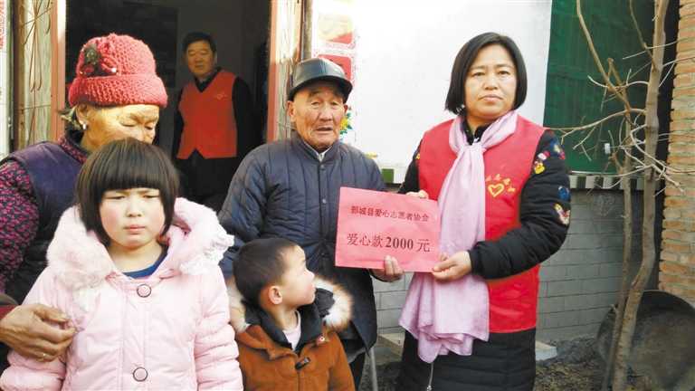 图为该爱心协会的志愿者们在彭楼镇的什李村,慰问失去父母跟着爷爷、奶奶生活的一双孤儿。
