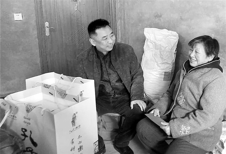 2月6日,山东孔子酒业董事长马俊来到市开发区丹阳街道办事处大马庄社区95岁老人洪廷云家、86岁社区老干部赵士相家、75岁老党员赵士群家,贫困户惠学华、何方莲、赵士文、韩秀荣、程效芝家等走访慰问,并送给每人500元红包、两提孔子国礼酒、大米和食用油等礼品。