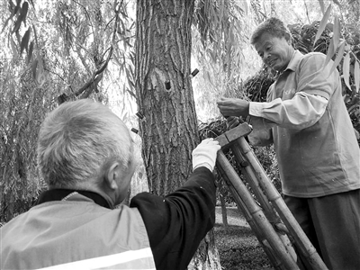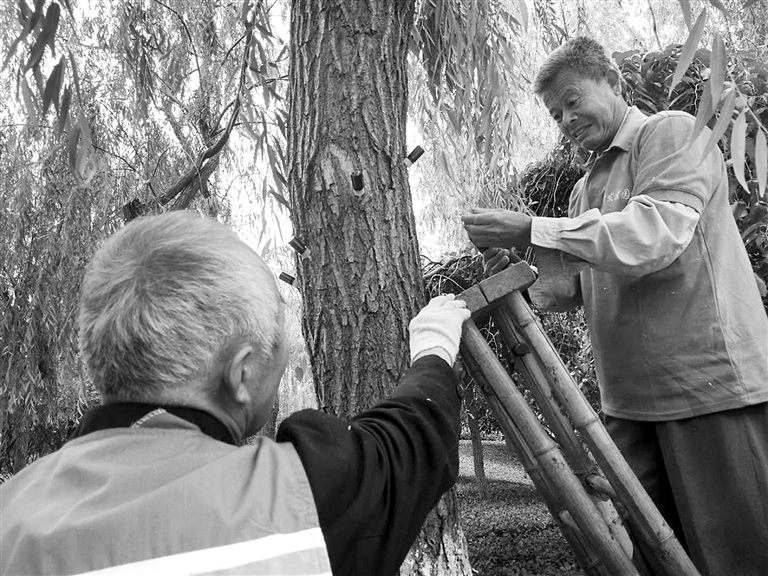 5月22日,市开发区园林管理处的工作人员正在天香路对路边的柳树进行药物注射。近年来,因市开发区内杨、柳絮问题较为严重,市民反映强烈,要求治理杨、柳絮。市开发区园林管理处尝试对杨柳树注射药物“飞絮一插净”,以求解决杨、柳絮污染,改善城市环境。 记者 王 浩 摄
