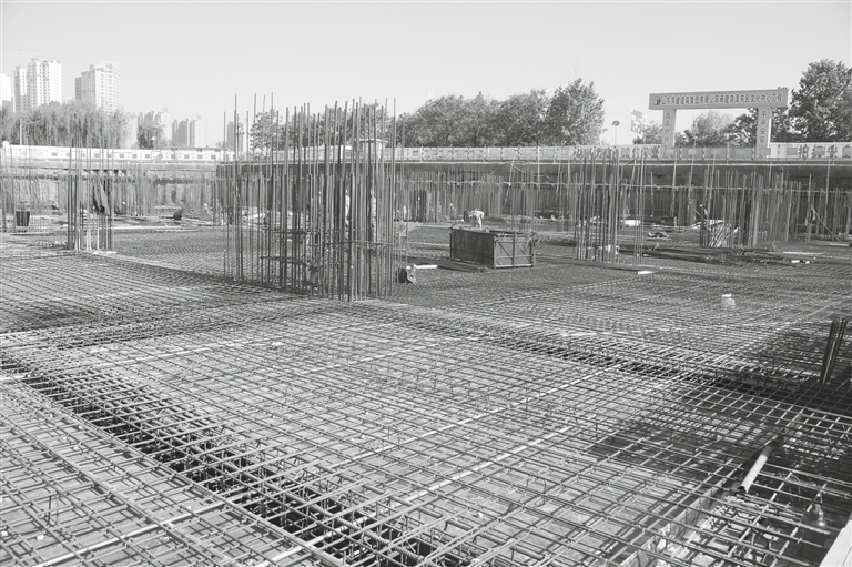 走进项目建设工地,首先映入眼帘的是一个弧形的巨大的钢筋水泥综合体,该综合体“倒插”地面以下,密密麻麻的钢筋水泥仿佛是编织一般,巨大的塔吊镶嵌其中正在作业,一眼望去,在巨大综合体下宛如豆丁的工人们正在有序作业,这个插在地下的庞然大物正是目前抓紧建设的北区地下工程。据施工现场负责人谢忠印介绍,地下工程主要为两层地下室,根据规划,地下一层是商场,地下二层是停车位。别看地下工程仅仅是两层地下室,但它却占整个工程一半任务量以上。