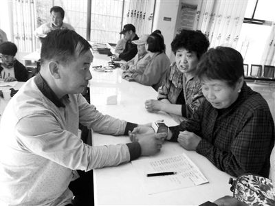 5月23日一大早,市开发区丹阳办事处赵堂社区的老人们早早来到社区领取老年补助金。“社区每月按时给我们老年人发‘工资’已经14年了。”刚刚领了补助金的刘氏老人高兴地说。据赵堂社区居委会主任赵忠涛介绍,每月阴历初九,是社区为218名60岁以上老人发放养老补助金雷打不动的日子,对于年长、腿脚不方便的老人,社区还专门派人送到家里。据了解,近年来,赵堂社区每年用在民生方面的资金有100多万元,不但为居民代缴城镇医保费和水费,每月还会免费为老年人进行健康查体和理发等服务,逢年过节慰问60岁以上老人及老弱病残户等,确保老年人老有所养、老有所乐、老有所医。图为赵堂社区老人在免费查体。 记者 黄啟峰 通讯员 马学民 摄