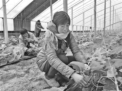12月7日,牡丹区沙土镇房庄行政村果蔬种植基地扶贫大棚内,村民们正在修剪南瓜苗。该项目由山东梓业农业开发有限公司进行承租,租期15年,年均租金为项目总投资的10%,通过项目租金分红,年底贫困户户均收益500余元。截至目前,沙土镇共计整合扶贫资金1484万元投入该项目,项目覆盖37个村,通过项目租金、贫困户务工增收、发展高效农业种植及生态观光旅游产业的形式,帮助贫困户尽早脱贫。 记者 李若生 摄