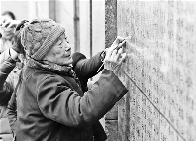 12月10日,南京大屠杀幸存者夏淑琴给遇难者名单墙上亲人的名字添漆。
