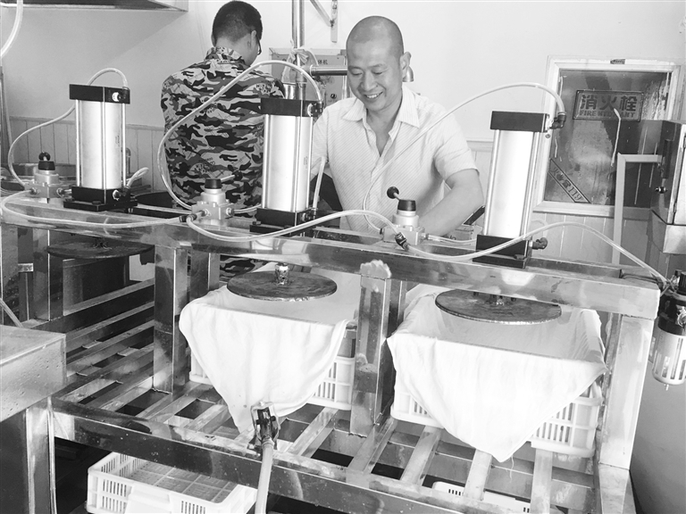 5月7日,在定陶区农贸城的五鑫豆腐坊内,定陶区马集镇姚堂村村民郭建民正在用新购进的设备制作豆腐。据了解,郭建民原是姚堂村的贫困户,2018年在村两委的帮扶下,购进了先进的豆制品加工设备,使用当地优良大豆为原料生产豆腐等豆制品,做出的食品在马集镇小有名气,现已脱贫致富,同时豆腐坊也带动了周边村民增收。 记者 张小彤 崔俊凤 摄