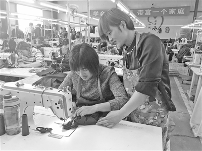 近日,鄄城县旧城镇葵堌堆行政村村民李娟,正在扶贫车间为女工教授缝纫技术。“我身有残疾,虽然我会缝纫,但一直没有施展的平台。去年看到这里的招聘信息,就报名来这里干活,上班后每月收入将近5000元。”李娟高兴地说。据了解,鄄城县对“就业扶贫车间”提供政策支持,利用县乡公共就业平台免费推荐用工,并为创业企业和个人提供资金和技术支持,优先为贫困户提供就业岗位,实现扶贫新成效。