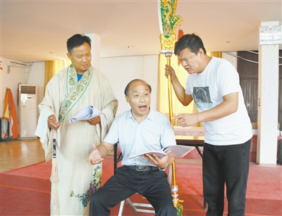 7月30日,在牡丹区大平调非遗保护传承中心排练厅,国家级非物质文化遗产项目大平调代表性传承人、国家一级演员何西良正在指点青年演员们排练戏曲《三顾茅庐》。