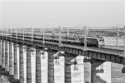 7月28日,一列“复兴号”动车组列车在机车的牵引下从兰新铁路红柳河特大桥驶过。