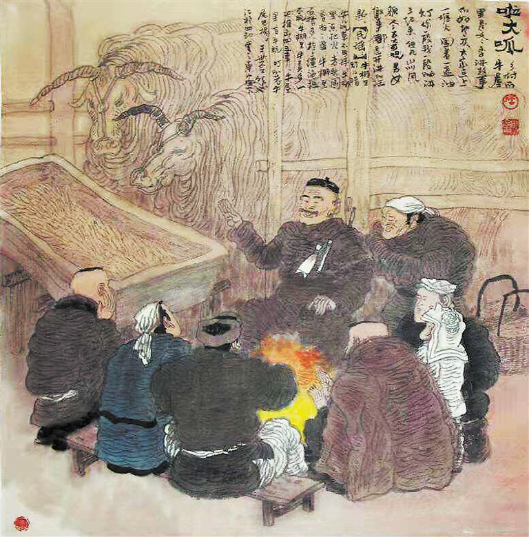 乡村农家牛屋,温暖而僻静,不受家庭琐事影响,是讲故事拉大呱的好去处。大家点上一盆炭火,闷上一缸子浓茶,围着一盏油灯,便你一句我一句聊起来。但凡山川风物、今古奇闻、家长里短、男女趣事,都是议论的话题。香喷喷的牛料味,火燎燎的旱烟味,暖烘烘的牛粪味,以及老牛吃草沙沙的响声,与听呱人哈哈的欢笑声,完全融在了一起,把乡村的夜晚渲染得温馨而浪漫。