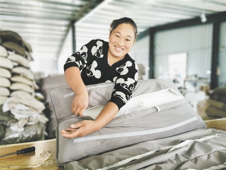 10月14日,在牡丹区小留镇鑫林家具生产车间,员工正在加工布艺床头。近年来,小留镇把优化企业服务、改善投资环境作为促进“返乡工程”的重要手段,通过开辟重点建设项目和企业投资“绿色通道”,为企业发展、项目建设保驾护航,全镇十余家企业提供就业岗位近5000个。 记者 李若生 摄