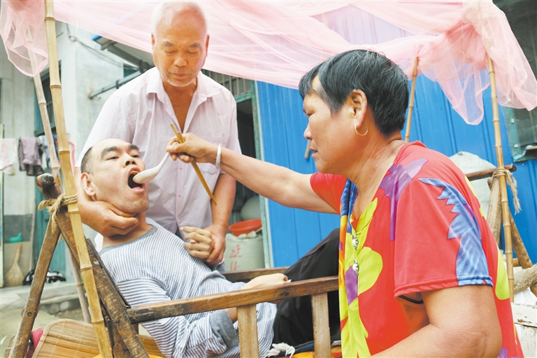 采访时,王师云揽着大儿子张海光,温和地问:“儿子,爹娘都养你40多年了,你该叫俺一声‘娘’了吧!”只见张海光昂着头、张着嘴,试图发声,终无果,随后两颗浑浊的泪珠从瞪圆的双眼里滚出。“儿子,娘听到了,你叫俺‘娘’了!”王师云潸然泪下。 文/图 通讯员 刘厚珉