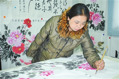 “海纳百川”“天行健,君子以自强不息”……在马萧冰的工作室,除了姹紫嫣红的牡丹画作,还有许多刚劲挺拔的励志名言,饱蘸浓墨的笔端融入了马萧冰的心血,成为她一生的陪伴。