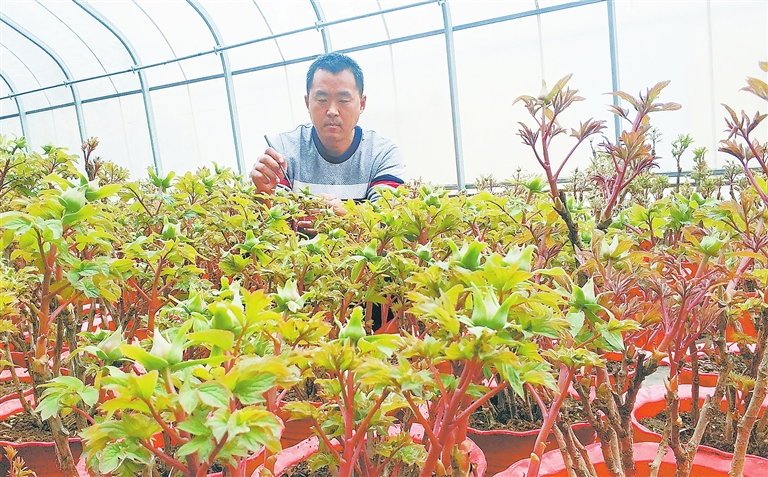 12月23日,牡丹区高级农技师赵弟行在管理催花牡丹,这些牡丹将于春节期间亮相年宵花市场。据赵弟行介绍,今年,牡丹区当地的催花牡丹在29万盆左右,预计每盆销售价格在90—130元之间。该区“下广”催花牡丹数量今年超过10万盆,在广州及其周边城市的春节花卉市场上,有九成以上的催花牡丹来自牡丹区。