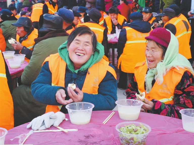 日前,郓城县张鲁集镇政府联合郓城农商银行张鲁集支行开展“关爱环卫工人 共建美丽乡村”公益活动,免费请环卫工人吃早餐,为全镇146名环卫工人送上棉大衣、烧水壶等爱心礼包和新年的美好祝福。 记者 付凤臣 通讯员 曾祥钧 摄